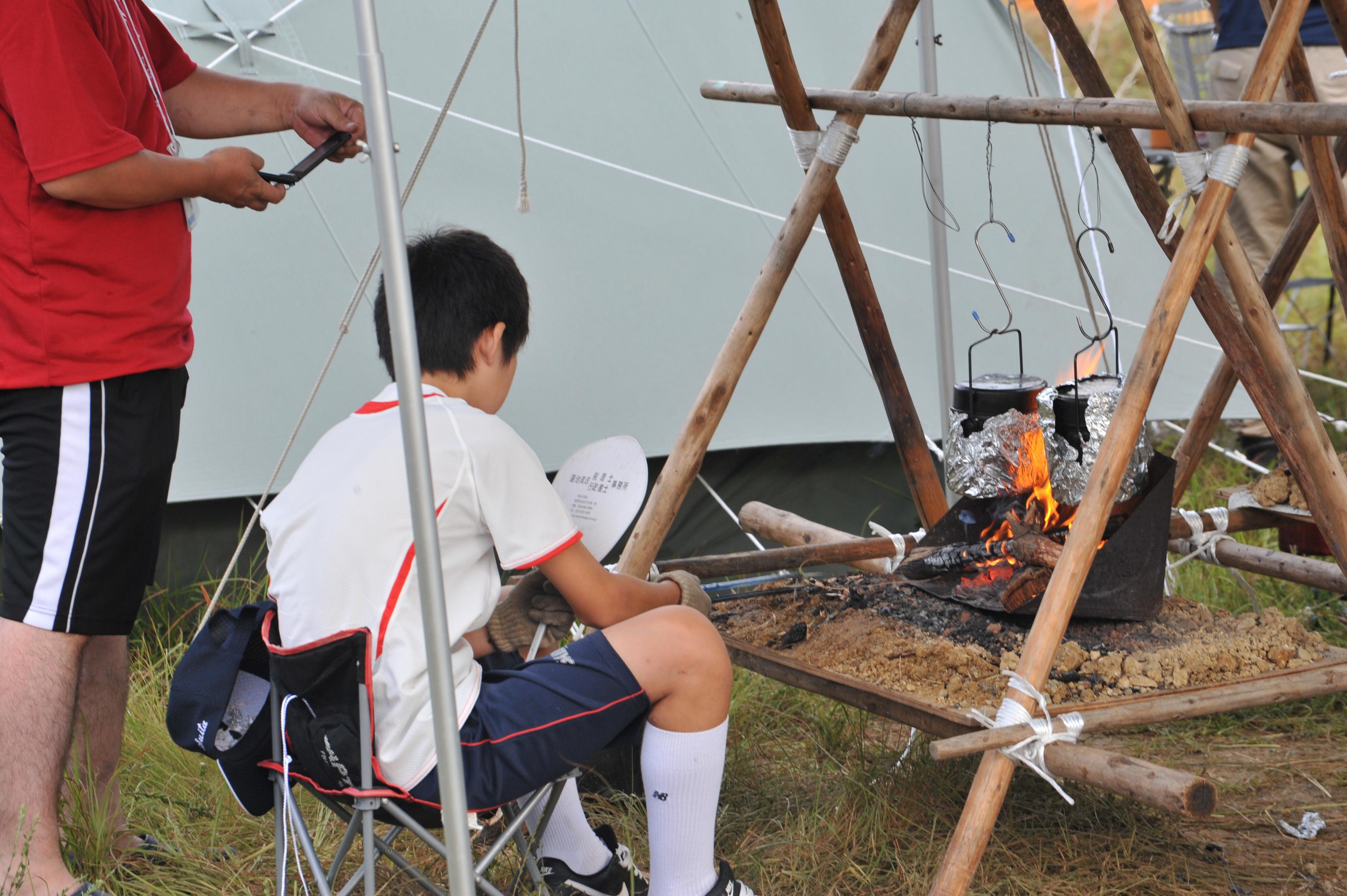 立ちかまどで夕飯づくり