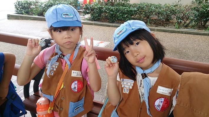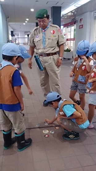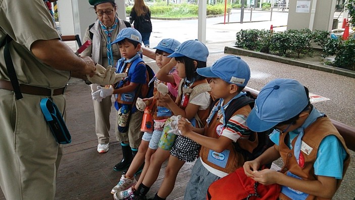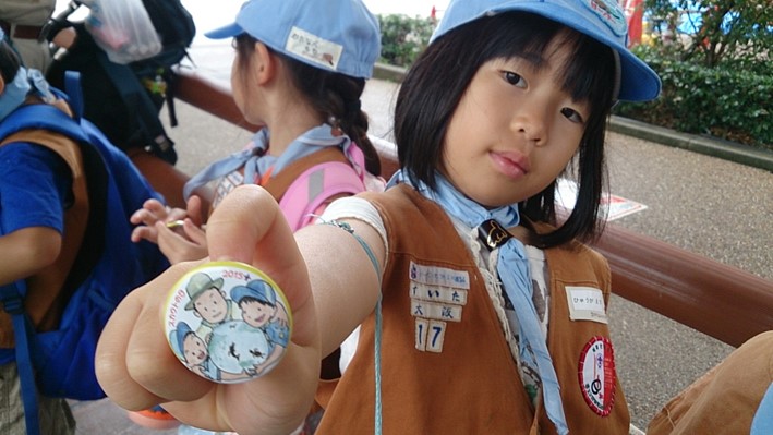 「スカウトの日」の缶バッチを受け取るスカウト達。