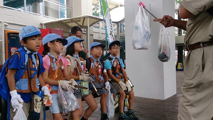 「こんなに沢山のタバコの吸い殻のポイ捨て」と見せるスカウト。