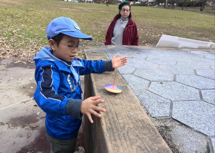 手作りコマで遊ぶスカウト、それを温かく見守る指導者。いいねぇ。