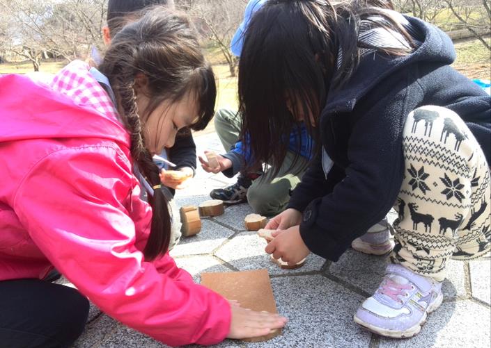 切った丸太を紙ヤスリで磨くスカウト。
