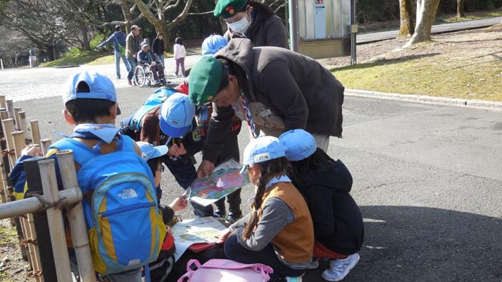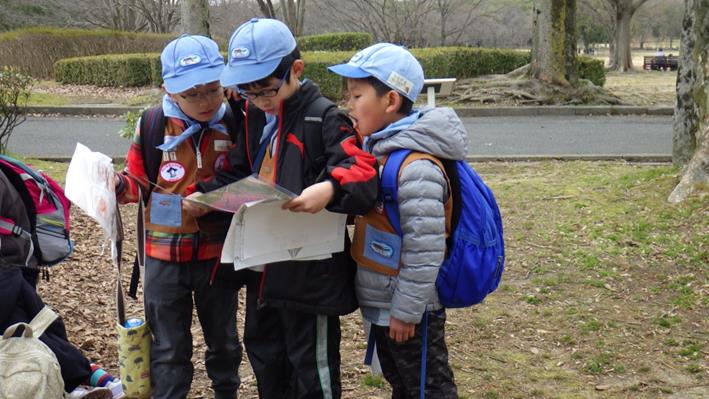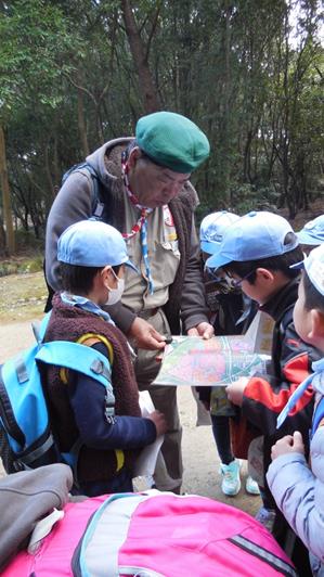 地図を見て、自分の現在地を確かめるスカウト達。