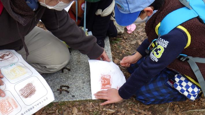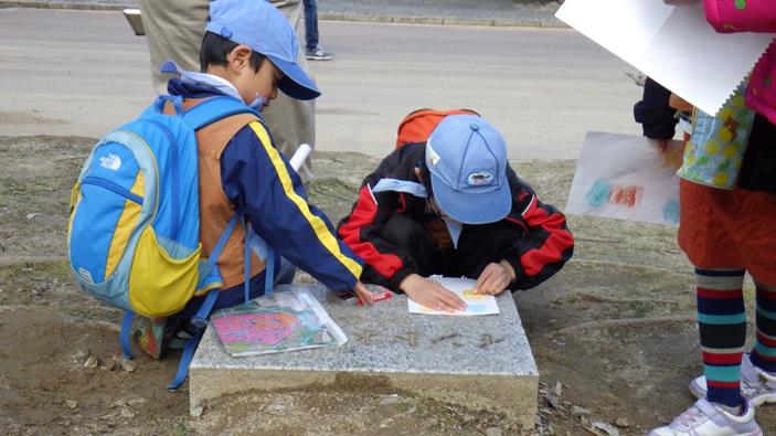 ポイントに着けば、順番に紙を当てて、クレヨン等でなぞります。