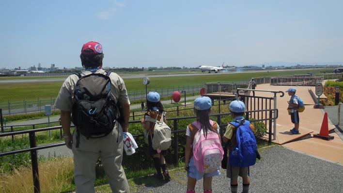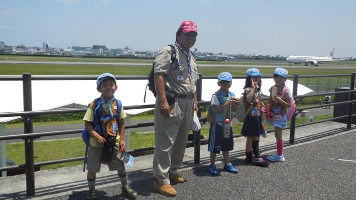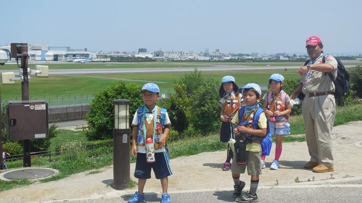 飛行機の着陸を見るスカウト達。
