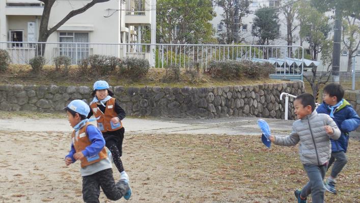 ケーキ作りの前に公園で、軽く「鬼ごっこ」。