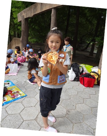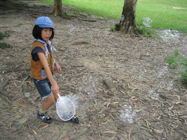 早起きハイク 2014年5月9日 ビーバー隊 2012.07.08 早起きして焼きたてパンをそれぞれがゲットして朝食後、シャボン液・道具を自分達で作り遊びました。 (活動のねらい) 与えられるのではなく、自分達で作る。