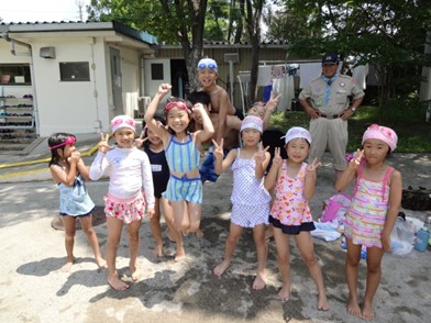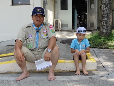 プールの水がなくなるから入れない隊長と調子が悪いので休憩しているスカウトのツーショット。