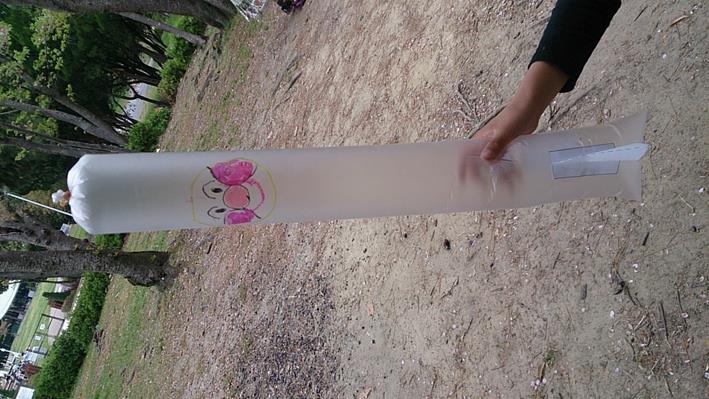 ビニール袋に絵を書いて、中に空気を入れて、羽根をつけたら完成。