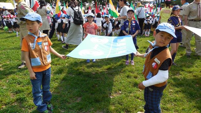 毎年恒例の行進での旗手係、一人骨折の固定ギブスをしての参加、
