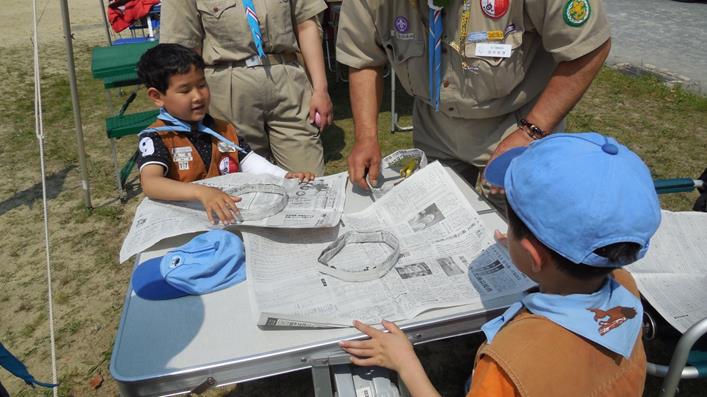 新聞フリスビー製作状況(自分達で遊び道具を作る、大事な事です)