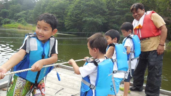 いかだ遊び、子供用ライフジャケットを確実に着用してのプログラム。