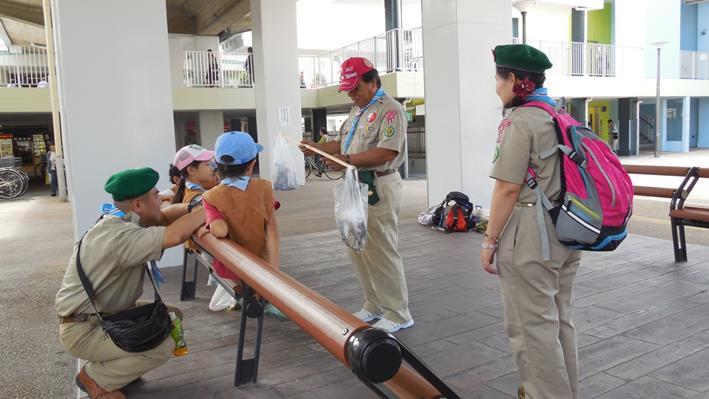 一本の棒を使って、阪急南千里駅前でスカウトが集めたゴミの重さ比べ、