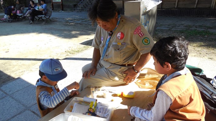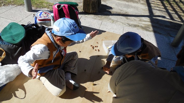 途中で拾ってきたドングリでドングリコマ作りに挑戦。