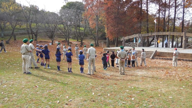 スカウトも体験入隊者も保護者も青空のもと、