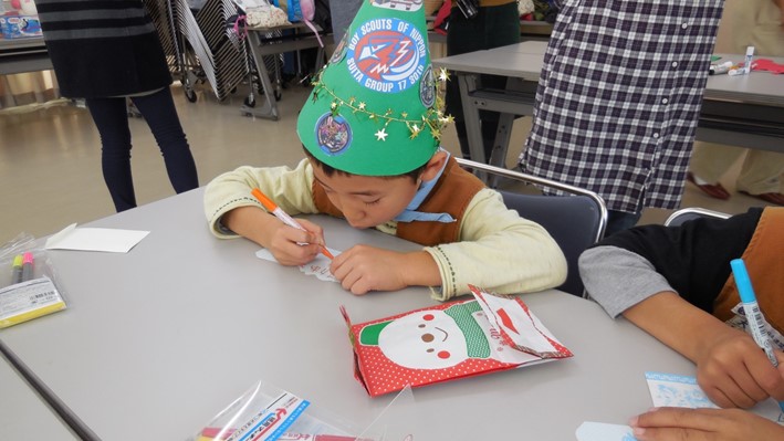 お父さん、お母さんに感謝の気持ちを手紙に書いているスカウト、