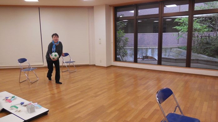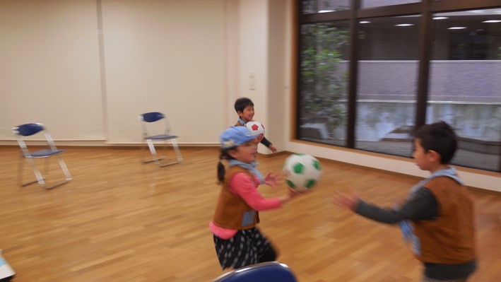 2チームに分かれて、ボール運びゲーム。(上写真)